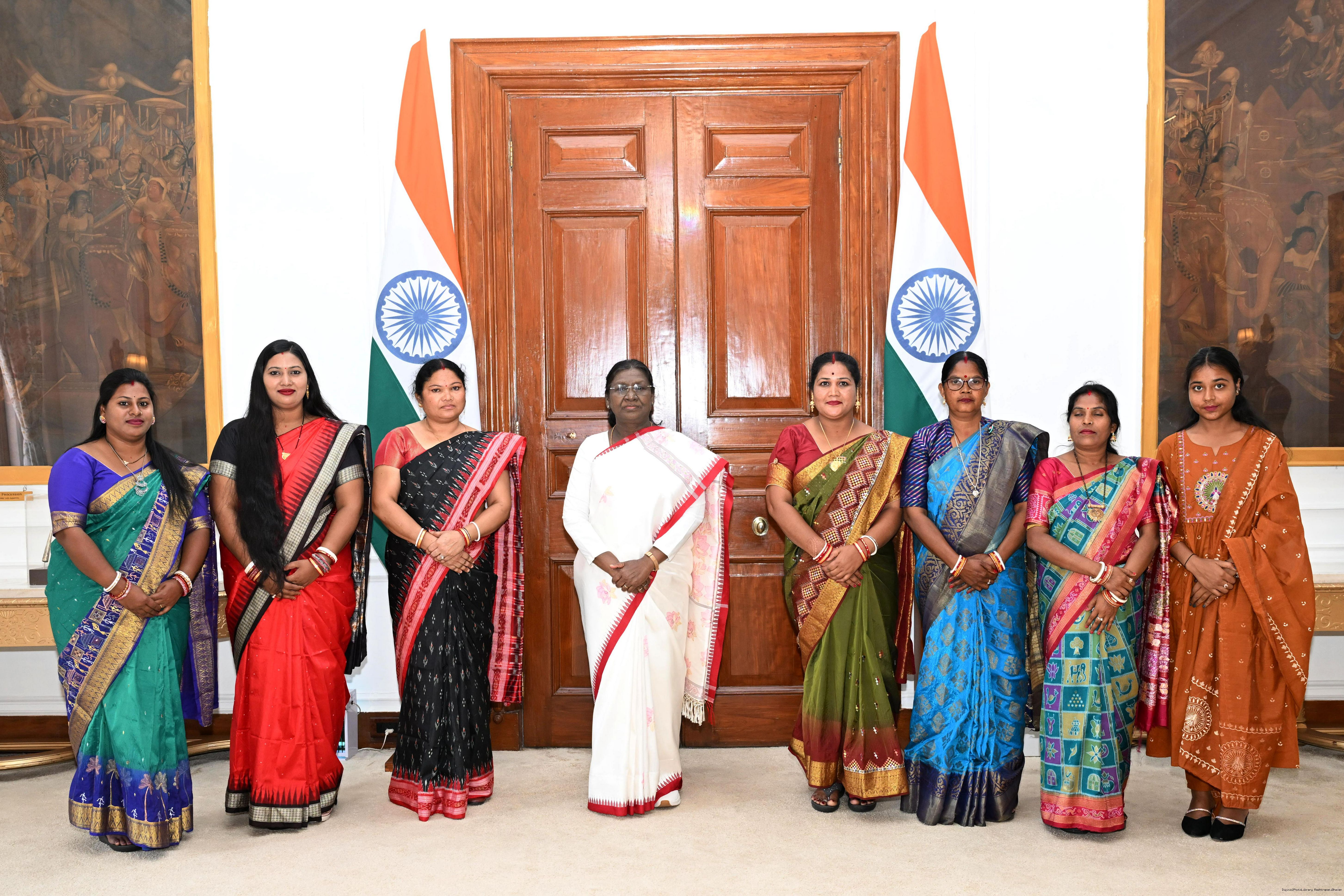 Ms. Nirupama Soren from Rairangpur along with Ms. Rani Mandal and others meeting with the President of India Smt. Droupadi Murmu at Rashtrapati Bhavan on March 2, 2026.