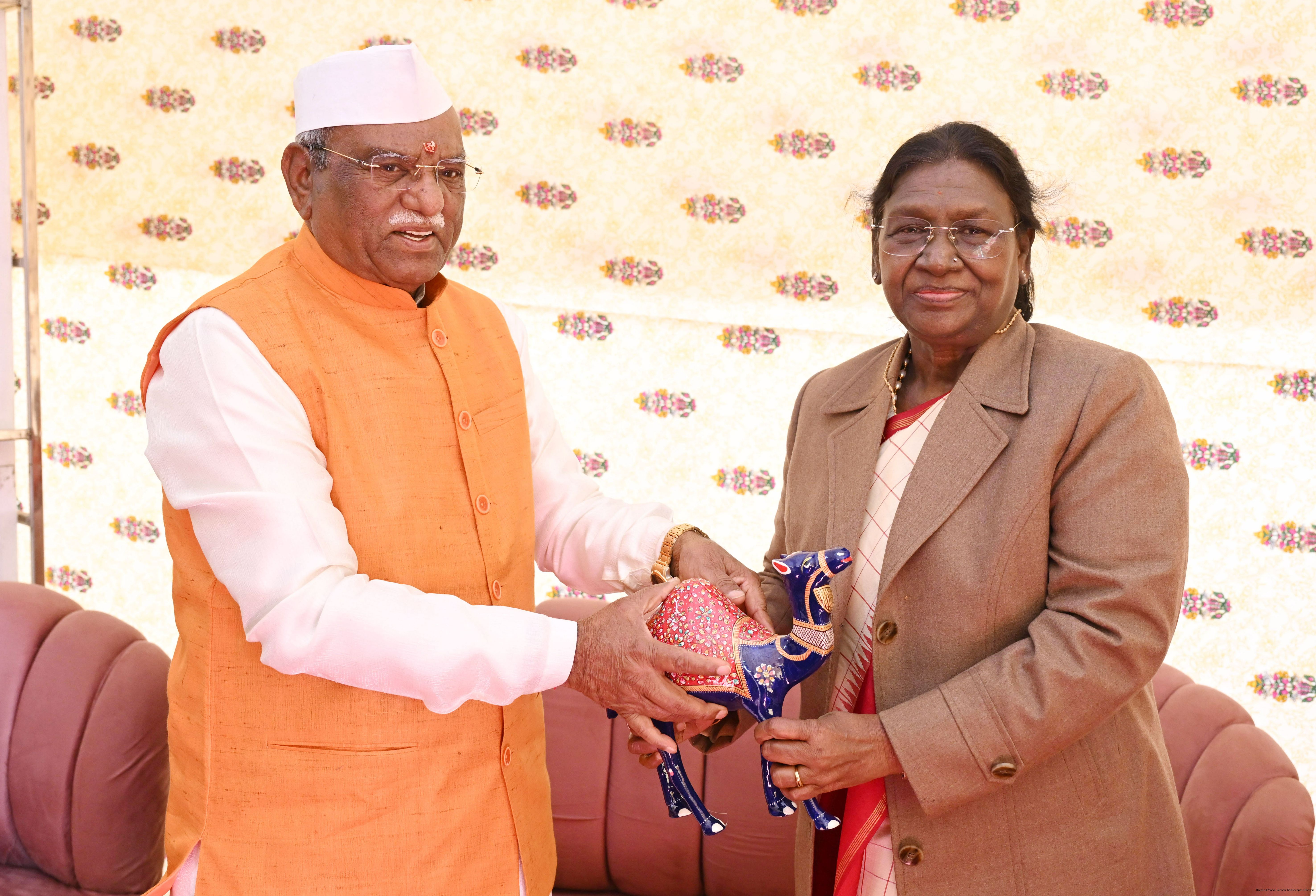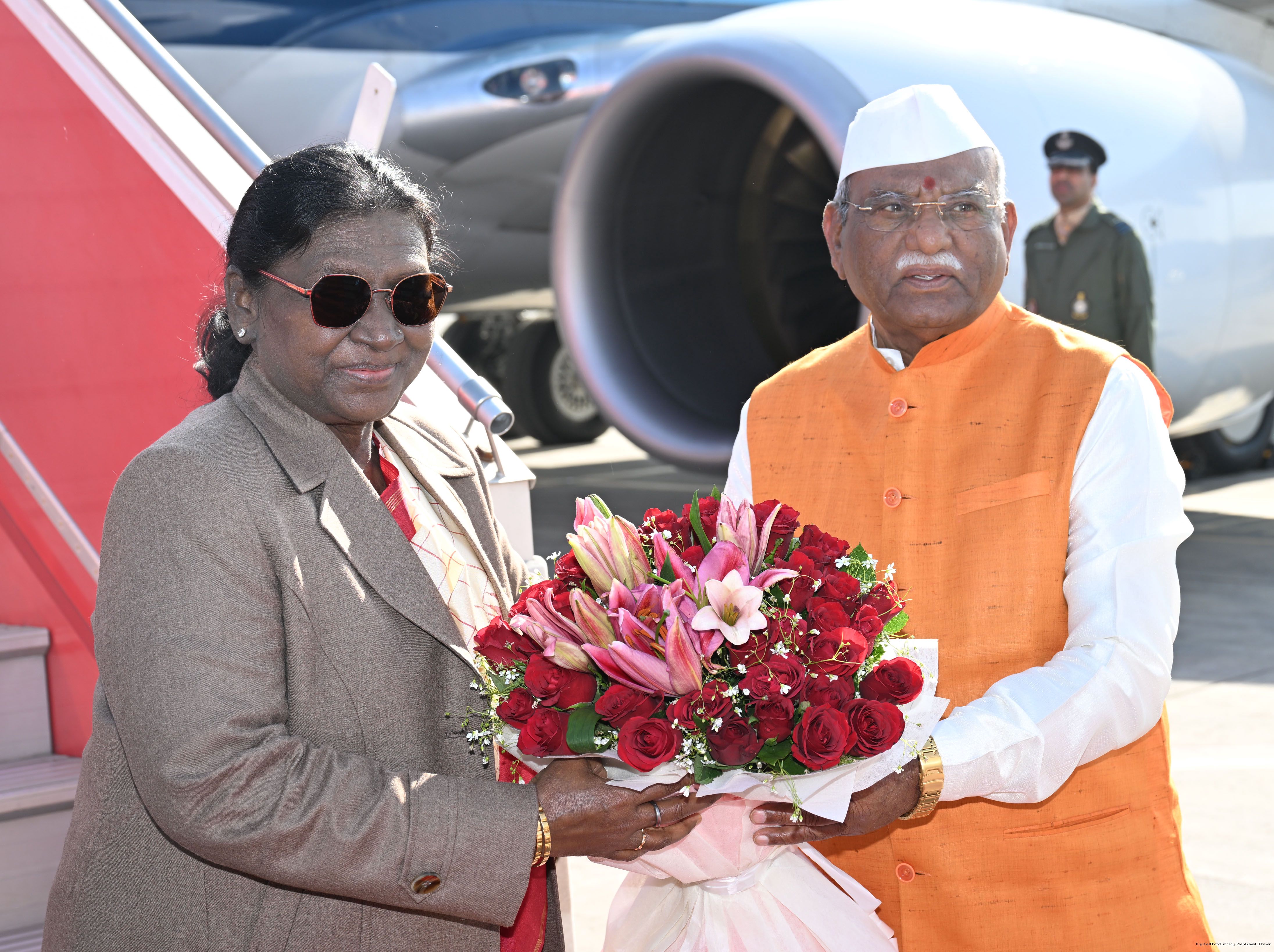 The Governor of Rajasthan, Shri Haribhau Kisanrao Bagde, Chief Minister Shri Bhajanlal Sharma and Deputy Chief Ministers Smt Diya Kumari and Dr. Prem Chand Bairwa received the President of India, Smt Droupadi Murmu on her arrival in Jaipur, Rajasthan on January 16, 2026.