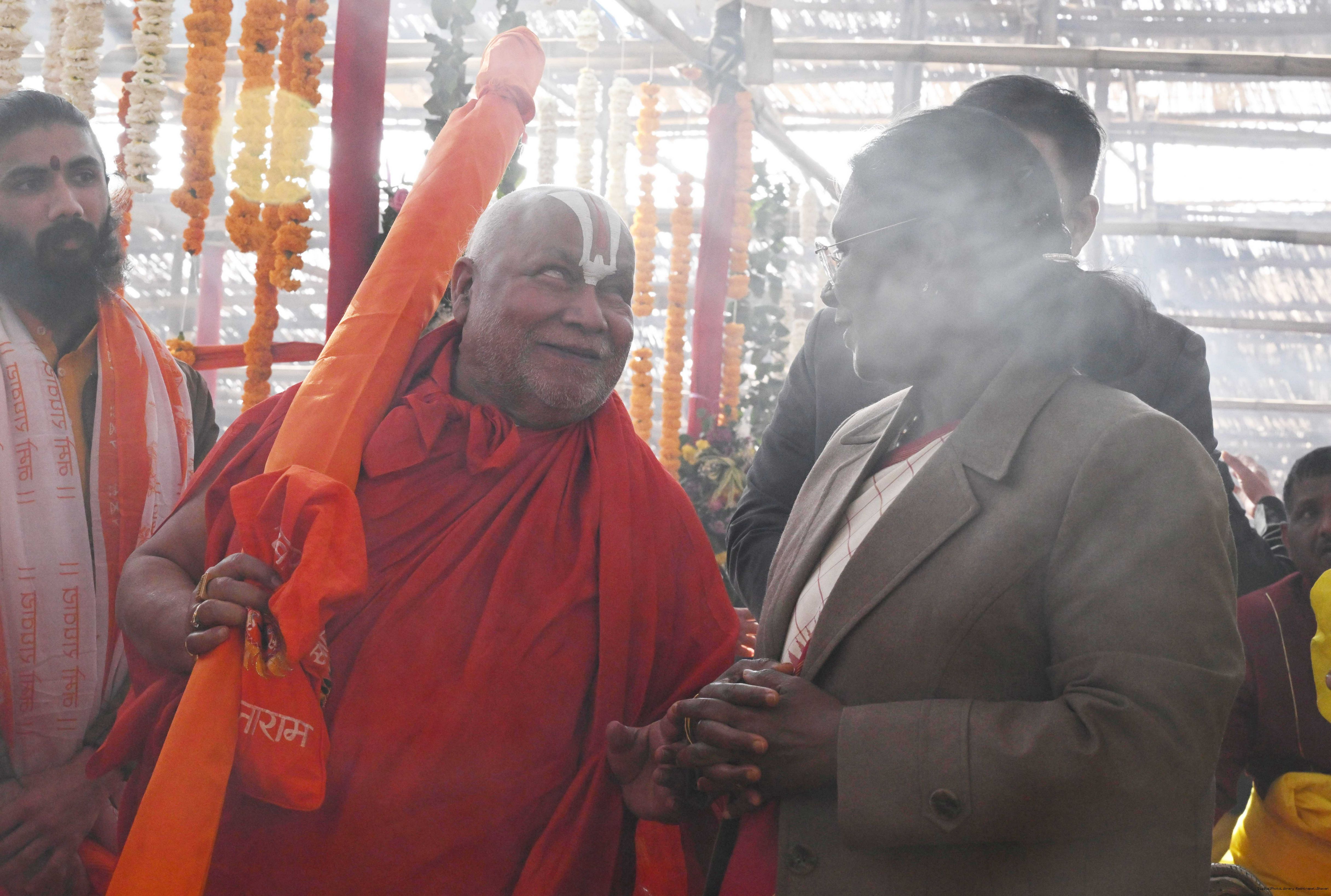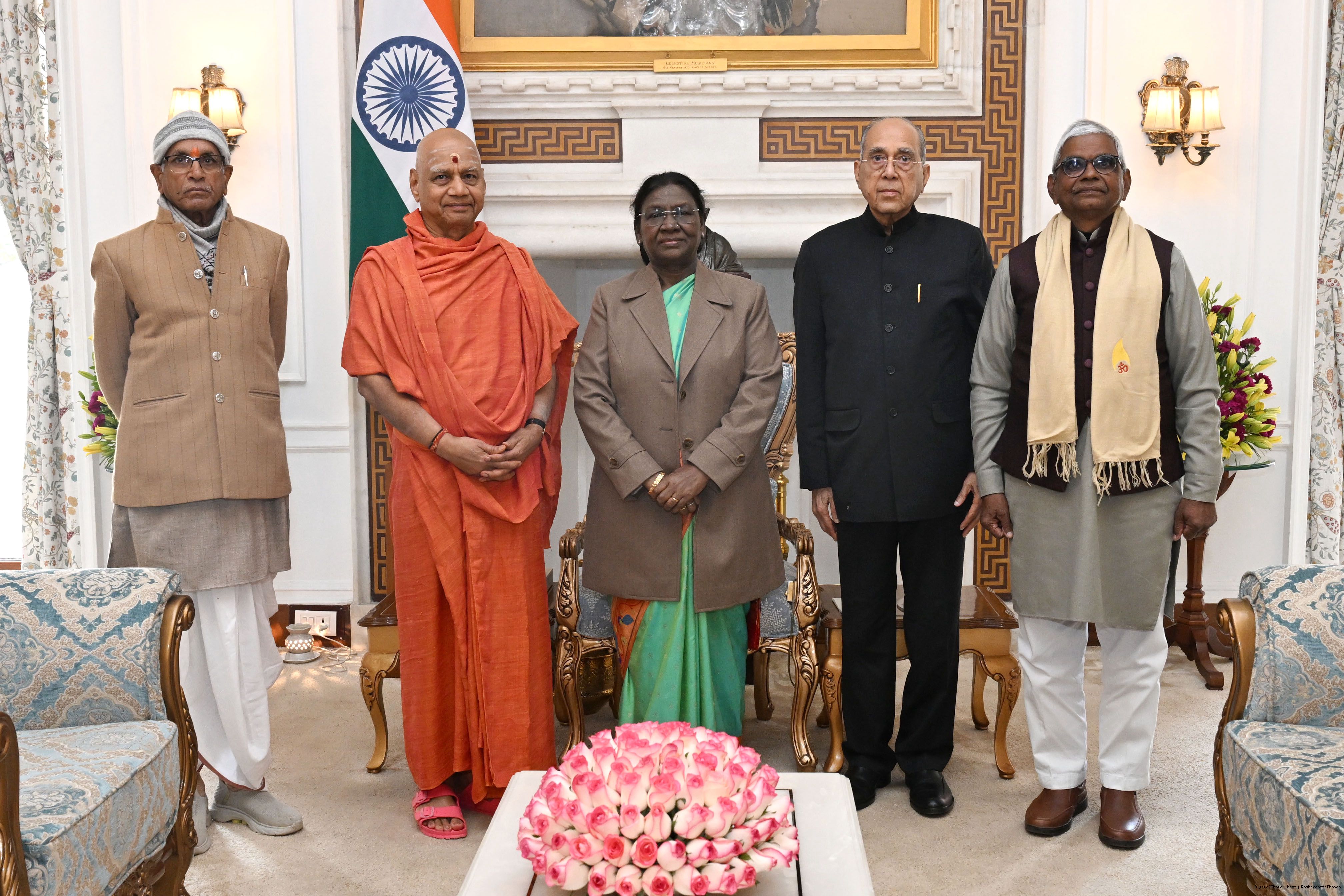Pujya Swami Govinddev Giri Ji Maharaj, Treasurer, Shri ram Janmbhoomi Teerth along with others meeting with the President of India, Smt Droupadi Murmu at Rashtrapati Bhavan on January 19, 2026.