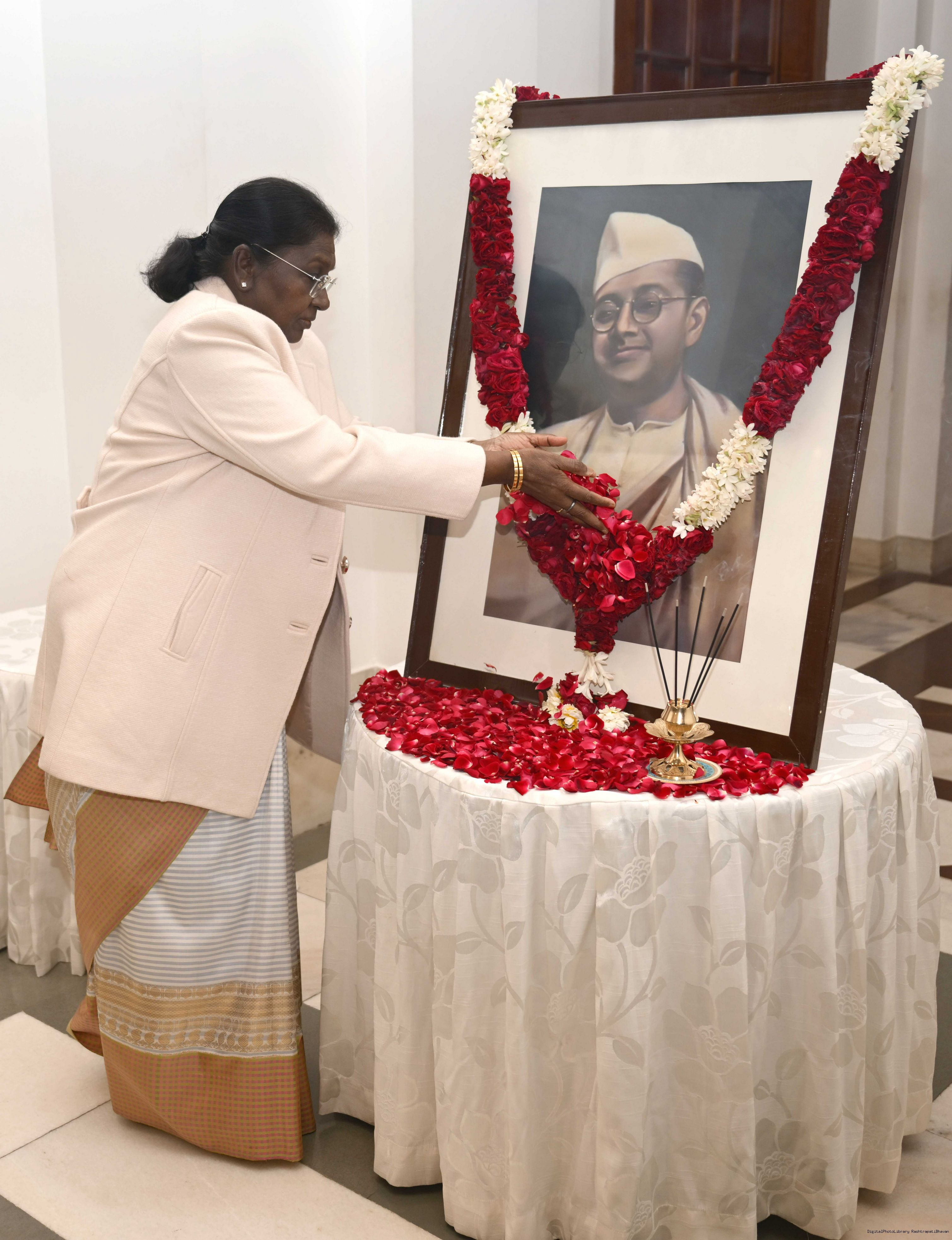 The President of India, Smt Droupadi Murmu, paid floral tributes to Netaji Subhas Chandra Bose on his birth anniversary, observed as Parakram Diwas, at Rashtrapati Bhavan on January 23, 2026.