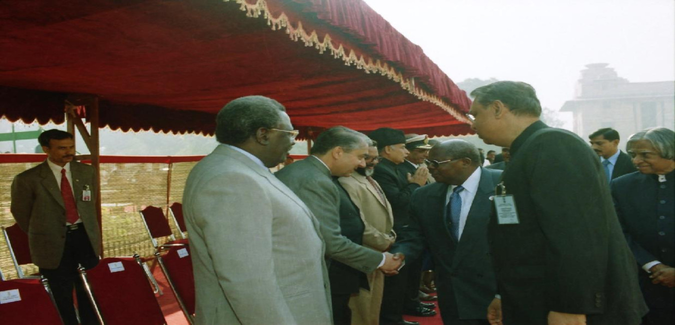 The President of India, Dr A P J Abdul Kalam at the Ceremonial Reception of the President of the United Republic of Tanzania, HE Mr Benjamia William Mkapa and his wife Mrs Anna Benjamin Mkapa at the Forecourt of Rashtrapati Bhavan in New Delhi on Dec 16, 2002