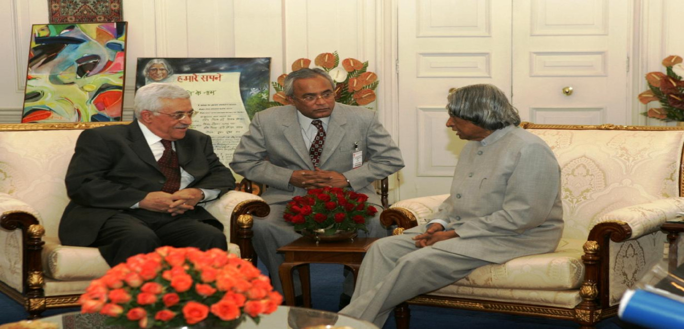 The Chairman of the Executive Committee of PLO and President of Palestinian National Authority, HE Mr Mahmoud Abbas calling on the President of India, Dr A P J Abdul Kalam at the Morning Room at Rashtrapati Bhavan in New Delhi on May 20, 2005