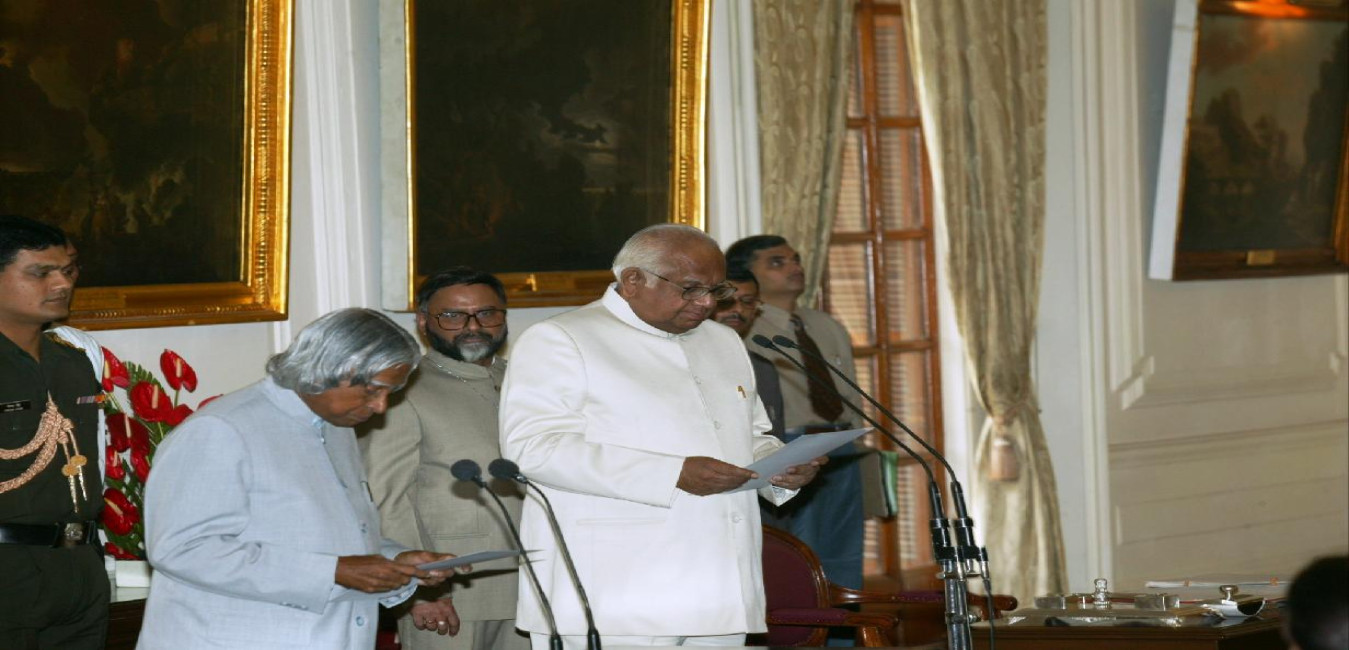 The President of India, Dr A P J Abdul Kalam administering the Oath of Office as Members of Parliament to Shri Somnath Chatterjee who is to Act as Speaker Pro-Tem of Lok Sabha at the Yellow Drawing Room of Rashtrapati Bhavan in New Delhi on June 02, 2004