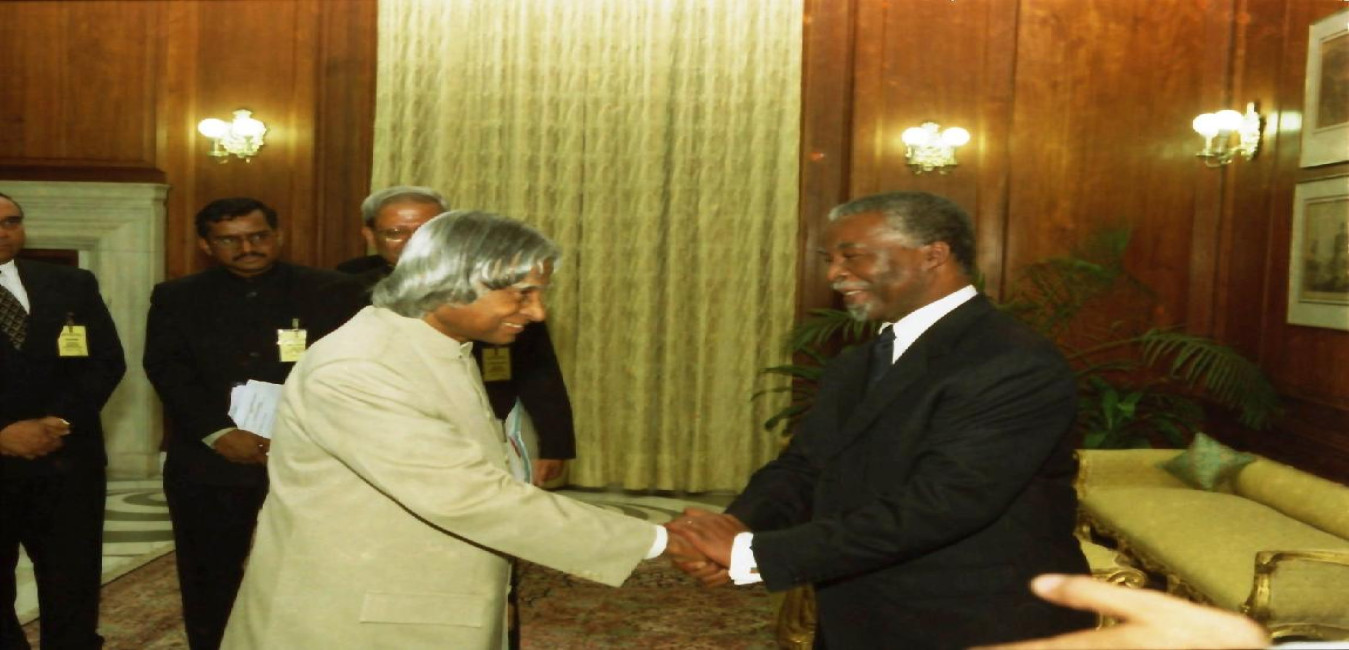 The President of the Republic of South Africa, His Excellency Mr T M Mbeki and Mrs Zanele Mbeki calling on the President of India, Dr A P J Abdul Kalam at the North Drawing Room of Rashtrapati Bhavan in New Delhi on Oct 16, 2003