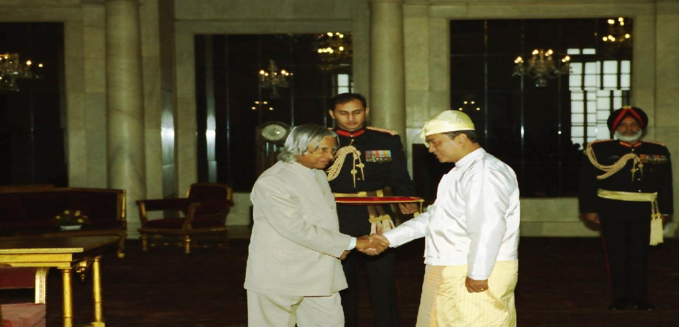 The Ambassador-Designate of Union of Myanmar, HE Mr U Kyi Thein presenting his credentials to the President of India, Dr A P J Abdul Kalam at the Ashok Hall of Rashtrapati Bhavan in New Delhi on Dec 30, 2003