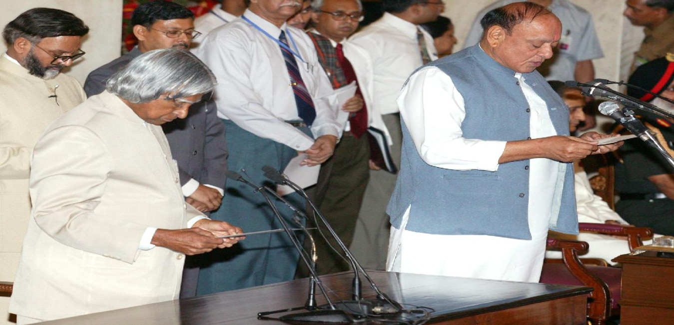 The President of India, Dr A P J Abdul Kalam administering the Oath of Office as Members of Parliament to Shri Somnath Chatterjee who is to Act as Speaker Pro-Tem of Lok Sabha at the Yellow Drawing Room of Rashtrapati Bhavan in New Delhi on June 02, 2004