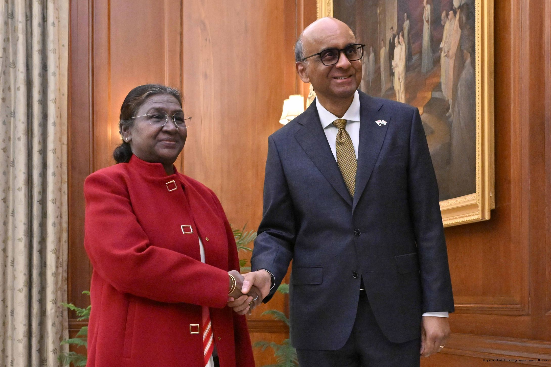 The President of India, Smt Droupadi Murmu at the farewell Call by Shri Ajay Kumar Singh, Former Press Secretary to the President along with spouse Smt. Anjali Singh at Rashtrapati Bhavan on October 7, 2025.