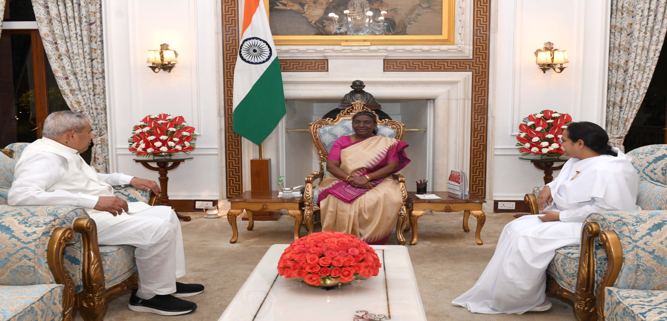 Dr. BK Mruthyunjaya, Executive Secretary, Brahma Kumaris and BK Leena, Additional Director, Value Education Programmes, HQs, Mount Abu meeting with the President of India Smt Droupadi Murmu at Rashtrapati Bhavan on April 22, 2024.