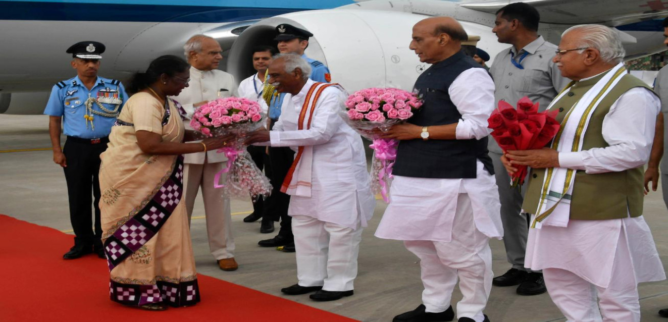 The President of India, Smt. Droupadi Murmu being received by the Governor of Punjab and Administrator of Chandigarh, Shri Banwarilal Purohit, Governor of Haryana, Shri Bandaru Dattatraya, Defence Minister, Shri Rajnath Singh and Chief Minister of Haryana, Shri Manohar Lal, on her arrival, at Chandigarh on October 08, 2022.