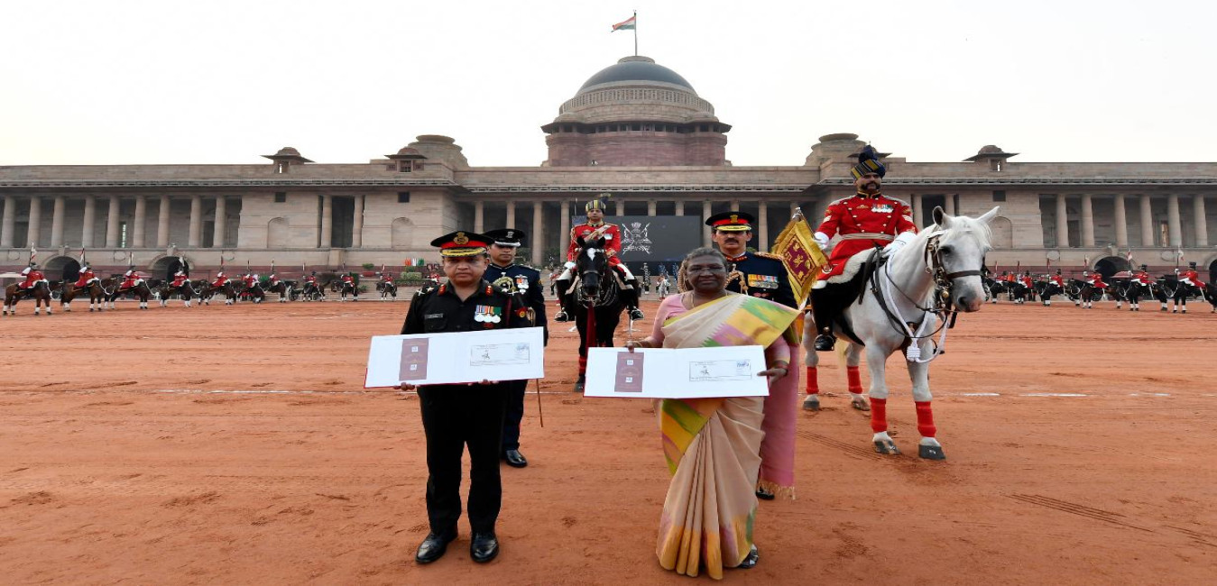 The President of India, Smt. Droupadi Murmu presented Silver Trumpet Trumpet Banner to the President s Bodyguard, at a ceremony, in Rashtrapati Bhavan on October 27, 2022.