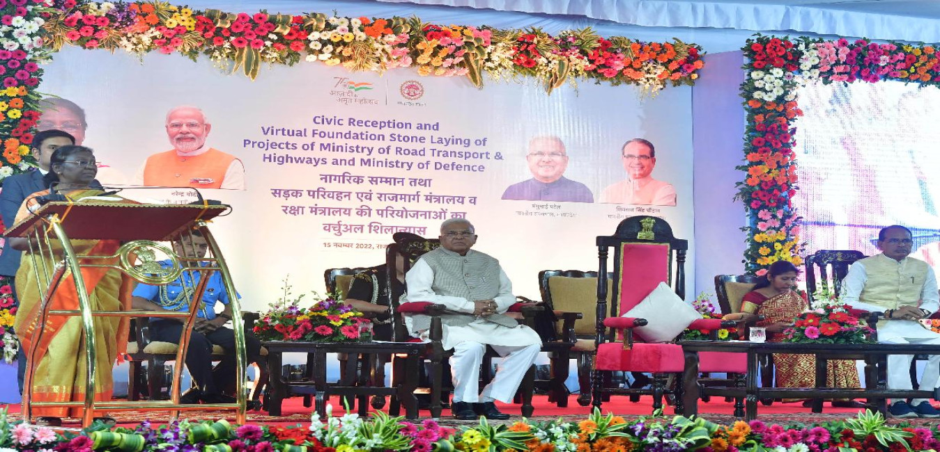 The President of India, Smt. Droupadi Murmu attended the civic reception hosted in her honour by the Government of Madhya Pradesh, at Raj Bhavan Bhopal and virtually laid the foundation stones for projects of Union Ministries of Defence and Road Transport & Highways on November 15, 2022.