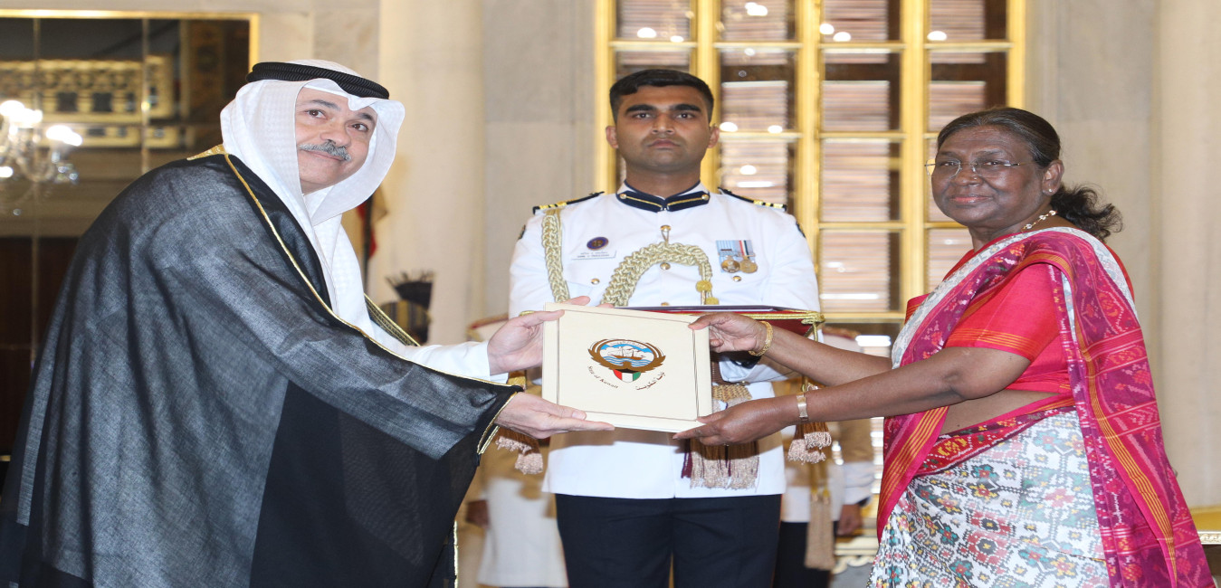 The Ambassador-designate of the State of Kuwait, H.E. Mr Meshal Mustafa J Alshemali presenting his credentials to the President of India, Smt Droupadi Murmu at a ceremony held at Rashtrapati Bhavan on May 31, 2024.