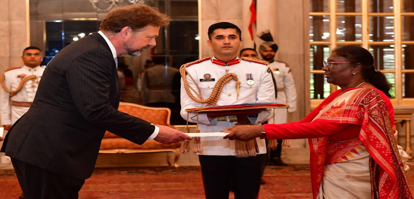The Ambassador-designate of the Federal Republic of Germany, H.E. Dr. Philipp Ackermann presenting his credentials to the President of India, Smt. Droupadi Murmu, at Rashtrapati Bhavan on August 26, 2022.