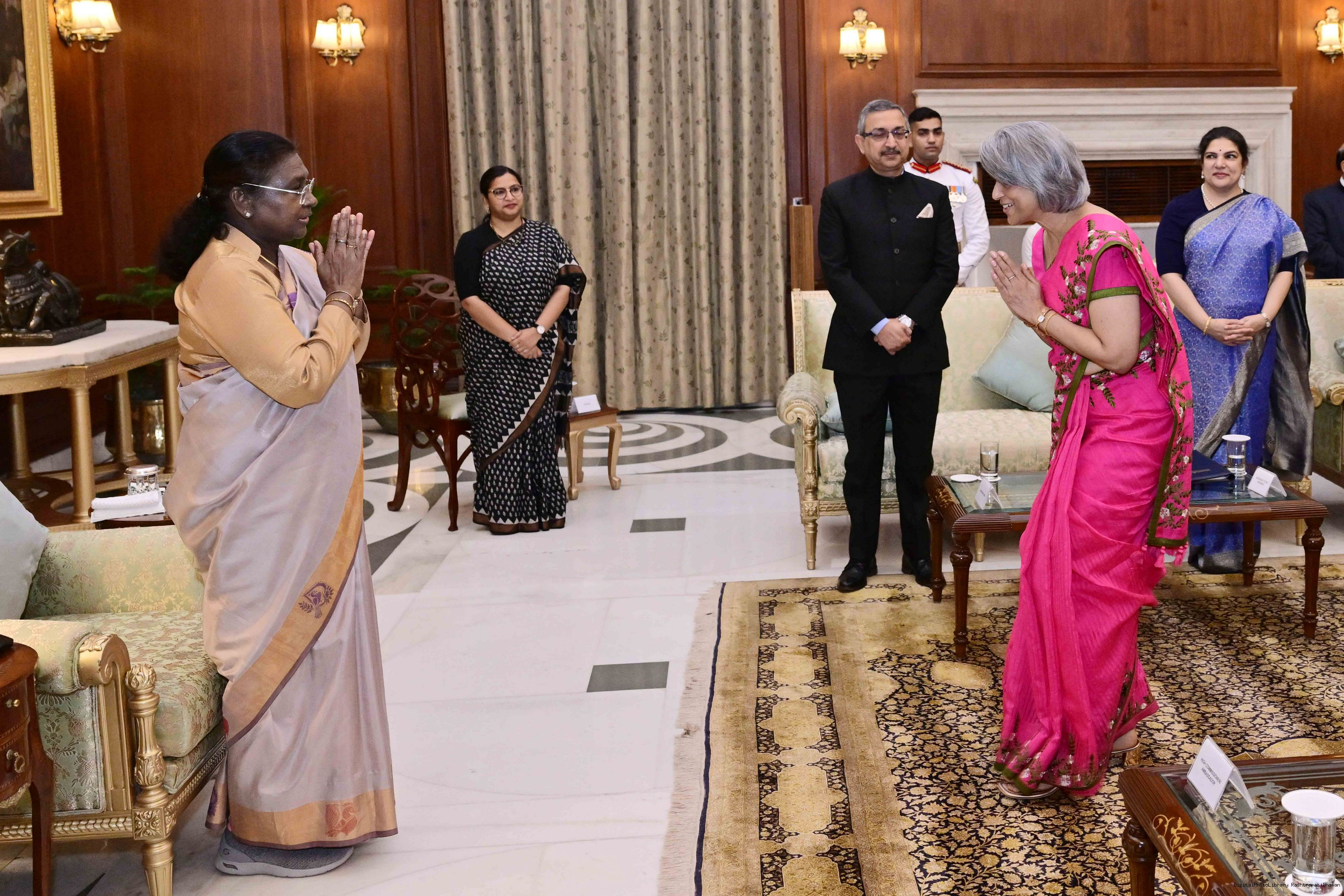 The High Commissioner-Designate of the Democratic Socialist Republic of Sri Lanka, H.E. Ms. Pradeepa Mahishini Colonee presenting her credentials to the President of India, Smt Droupadi Murmu at the Ashok Hall of Rashtrapati Bhavan in New Delhi on July 29, 2025.