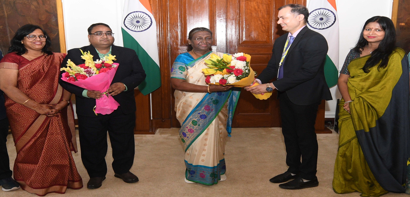 Shri Sumit Khandelwal, Zonal Manager, UCO Bank, New Delhi along with others meeting with the President of India Smt Droupadi Murmu at Rashtrapati Bhavan on April 12, 2024.