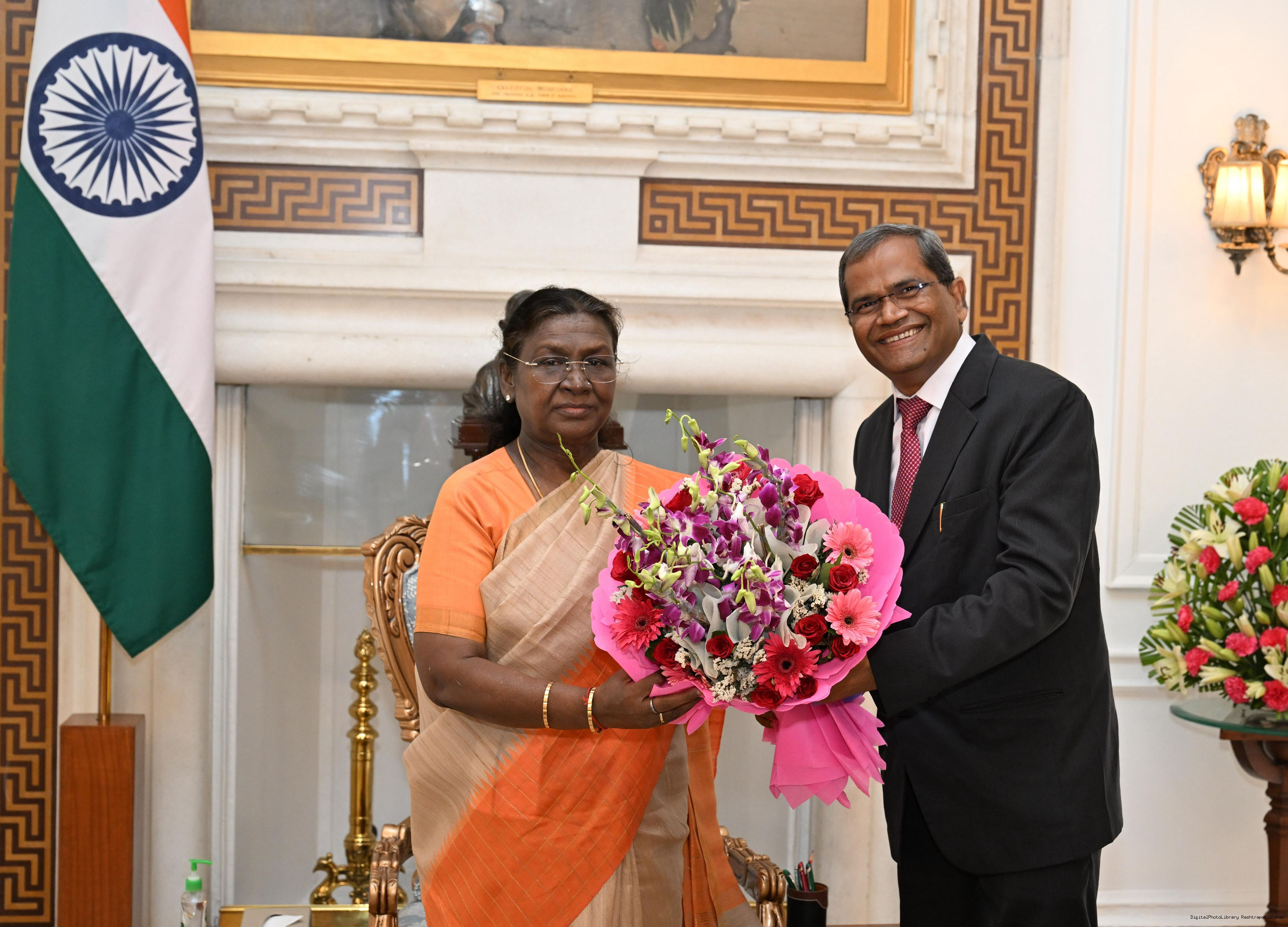 Shri Suresh Yadav, former OSD to the President and Senior Director in the Commonwealth Sectt, London meeting with the President of India, Smt. Droupadi Murmu at Rashtrapati Bhavan on April 21, 2025.