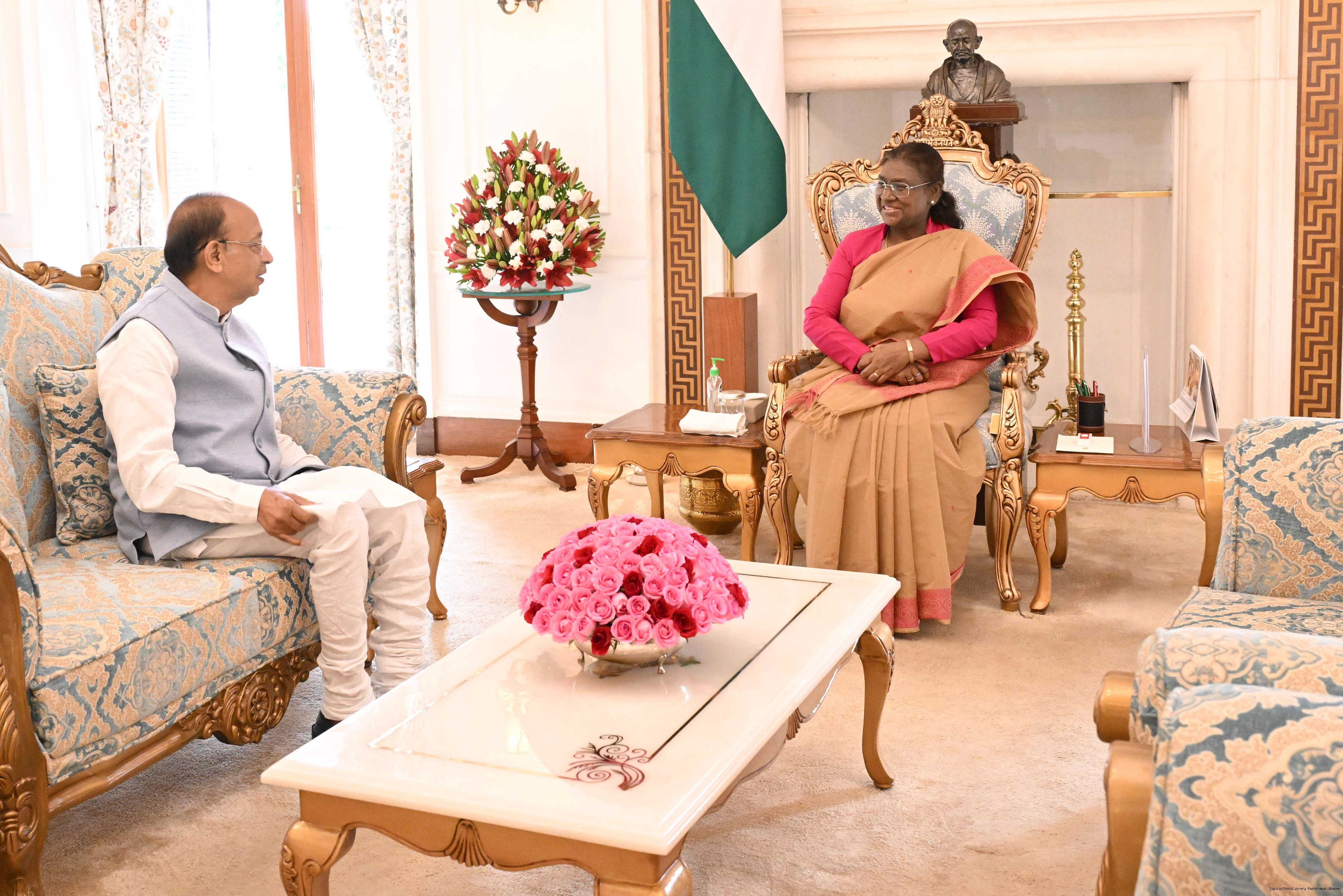 Shri Vijay Goel, Vice Chairman, Gandhi Smriti and Darshan Samiti meeting with the President of India, Smt. Droupadi Murmu, at Rashtrapati Bhavan on Sep 12, 2022.