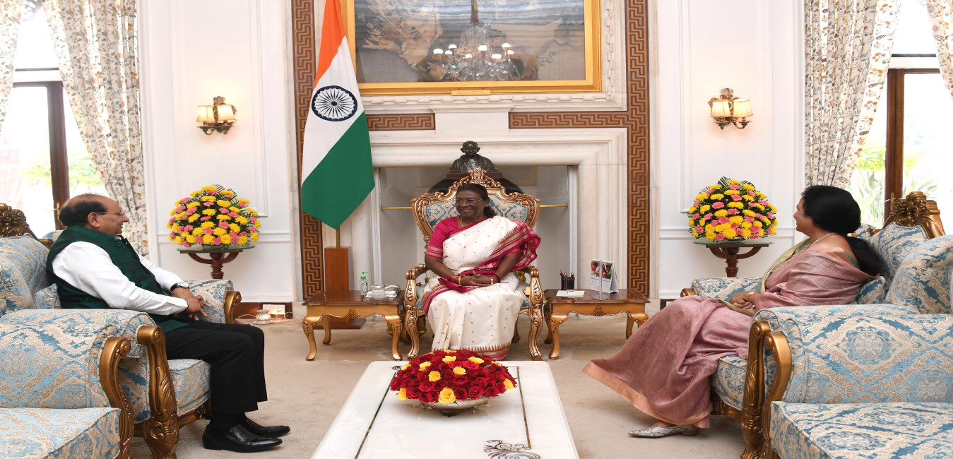 Shri Vinai Kumar Saxena, Lt Governor of Delhi along with wife Smt. Sangita Saxena called on the President of India, Smt. Droupadi Murmu at Rashtrapati Bhavan on November 17, 2023.