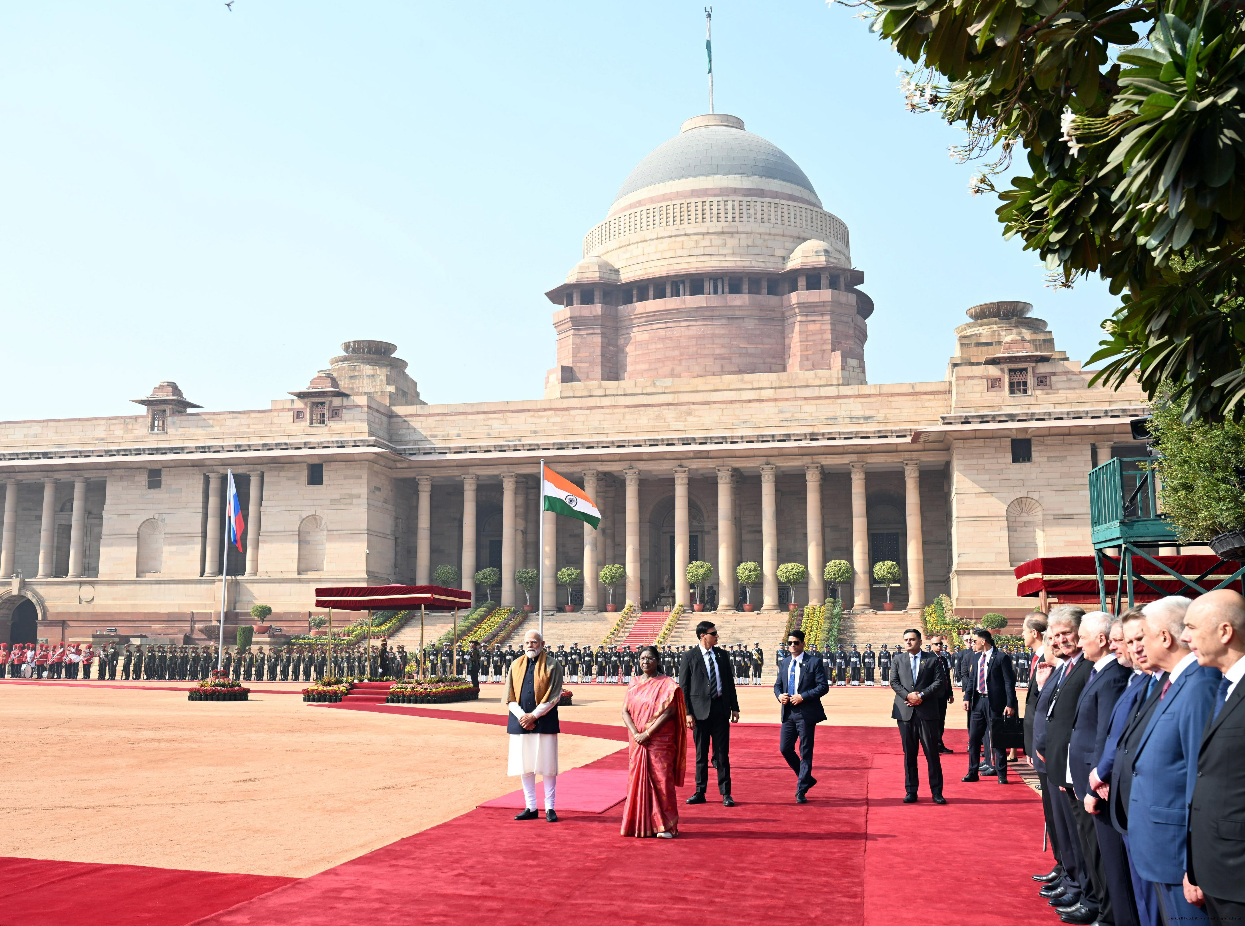 The President of India, Smt. Droupadi Murmu accorded a ceremonial welcome to H.E. Mr Vladimir Putin, President of the Russian Federation, at Rashtrapati Bhavan on December 5, 2025.