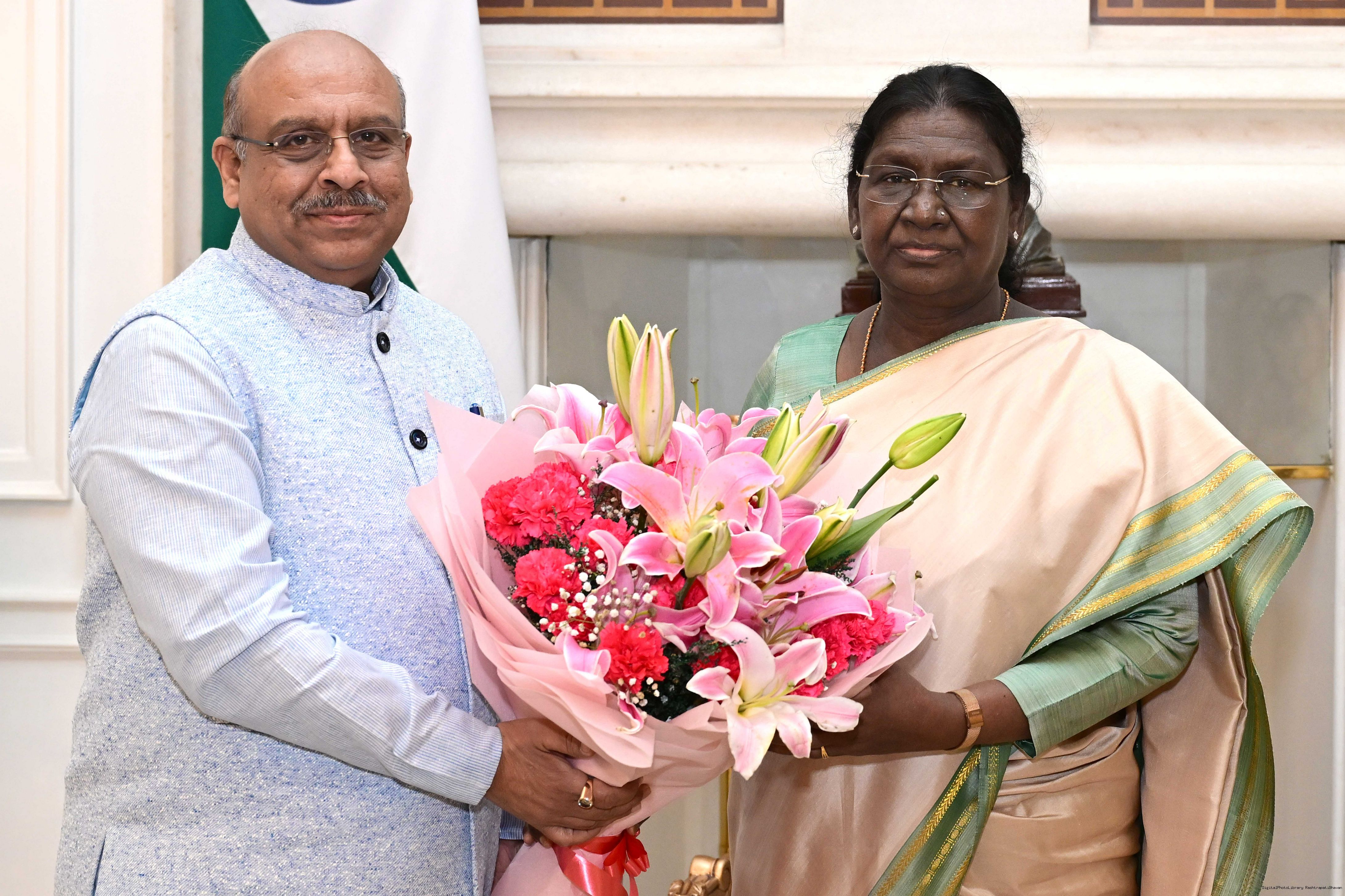 Shri Vijay Kumar, Secretary, Ministry of Ports, Shipping and Waterways along with others meeting with the President of India, Smt Droupadi Murmu at Rashtrapati Bhavan on March 30, 2026.