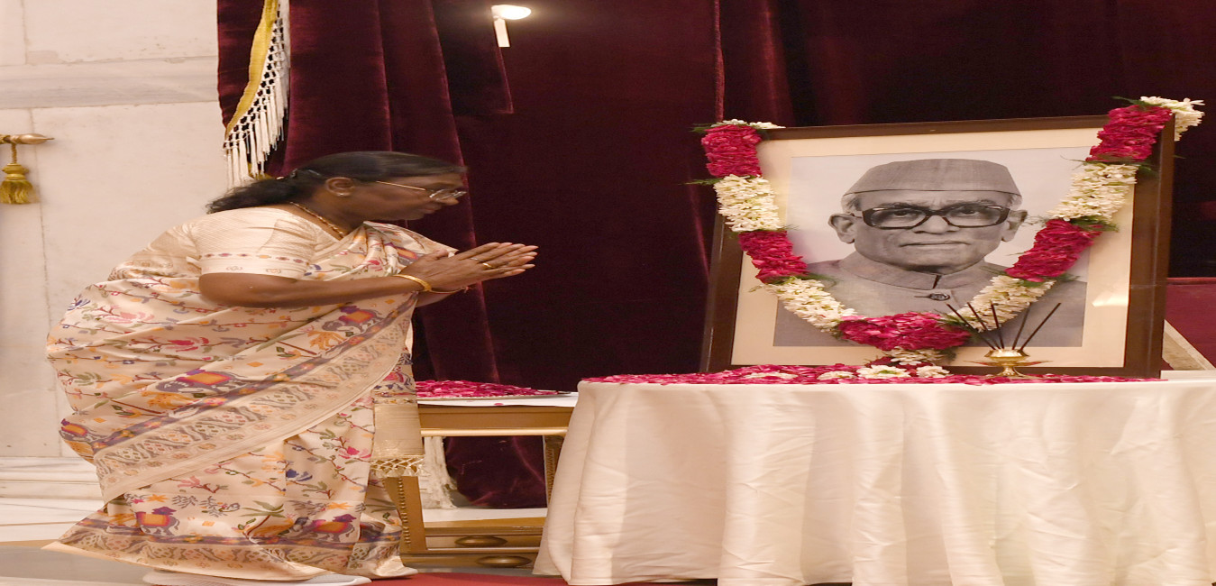The President of India, Smt Droupadi Murmu paid floral tributes to Shri Fakhruddin Ali Ahmed, former President of India on his birth anniversary at Rashtrapati Bhavan on May 13, 2024.