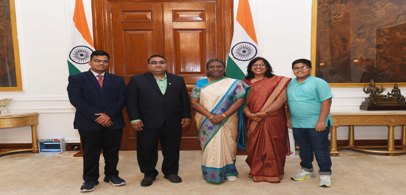 Shri Gunjan Kumar Mohanta So late Shri Iswar Mohanta along with others meeting with the President of India Smt. Droupadi Murmu at Rashtrapati Bhawan on April 15, 2024.