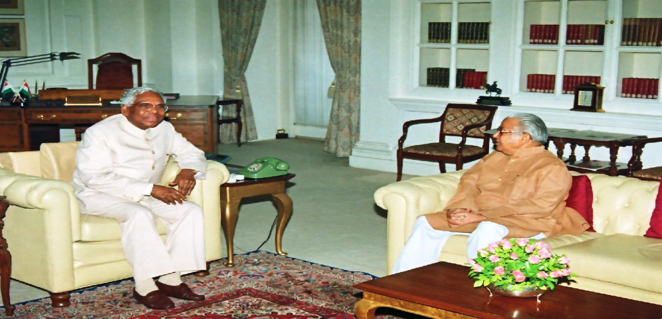 The President of India, Shri K R Narayanan meeting with the Governor of Rajasthan, Shri Bali Ram Bhagat at Rashtrapati Bhavan in New Delhi on Sep 09, 1997
