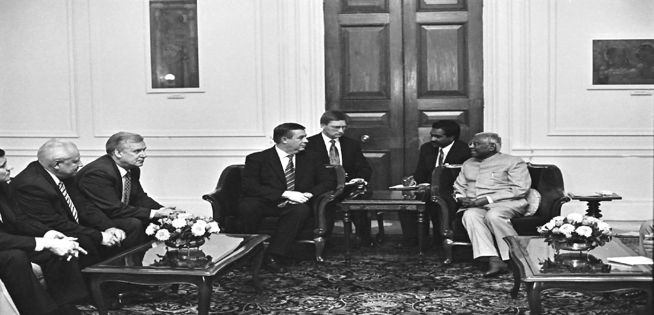 A Russian Parliamentary Delegation led by Chairmen of the State Duma of the Russian Federation, HE Mr Gennady N Seleznev calling on the President of India, Shri K R Narayanan at the Morning Room of Rashtrapati Bhavan in New Delhi on Nov 25, 1997