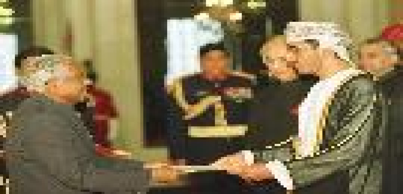 The Ambassador-Designate of the Sultanate of Oman to India, HE Mr Khalifa Bin essa Al Harthy presenting his credentials to the President of India, Shri K R Narayanan at the Ashok Hall of Rashtrapati Bhavan in New Delhi on Jan 20, 1999