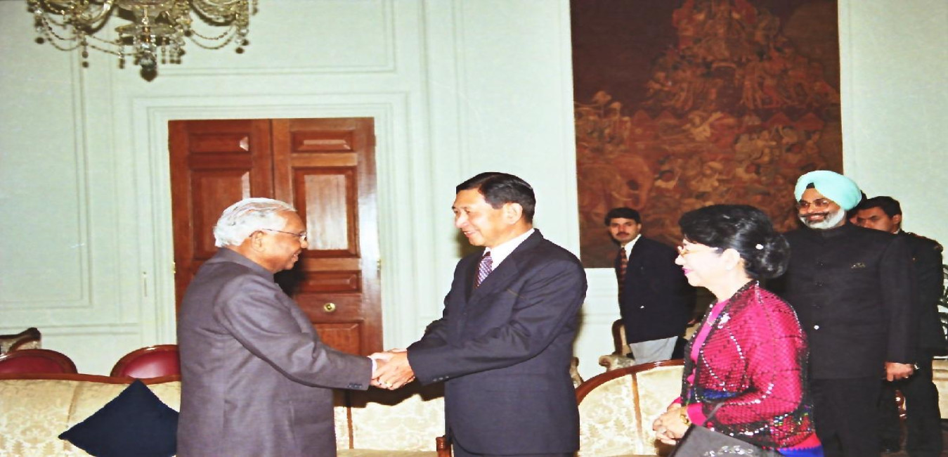 The Vice Chairman of the State Peace and Development Council of Myanmar, HE General Maung Aye and Daw Mya Mya San calling on the President of India, Shri K R Narayanan at the Morning Room of Rashtrapati Bhavan in New Delhi on Nov 17, 2000