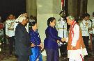 The President of India, Shri K R Narayanan at the Ceremonial Reception of the President of the Republic of Indonesia, HE Mrs Megawati Soekarnoputri at the Forecourt of Rashtrapati Bhavan in New Delhi on April 03, 2002