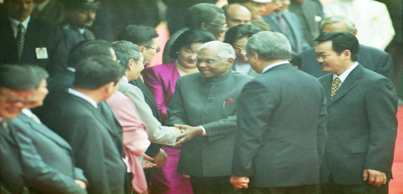 The President of India, Shri K R Narayanan at the Banquet Hosted in Honour of the Distinguished Guests of the President of Mongolia HE Mr Natsagiin Bagabandi and his wife Mme A Oyunbileg at the Banquet Hall of Rashtrapati Bhavan in New Delhi on Jan 03, 2001