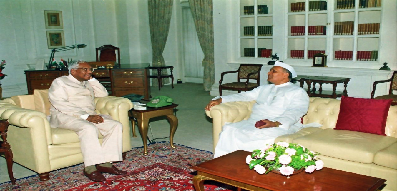 The President of India, Shri K R Narayanan meeting with the Governor of Tripura, Prof Siddheshwar at Rashtrapati Bhavan in New Delhi on Aug 26, 1997