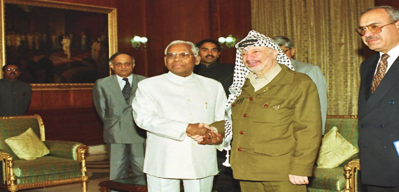 The President of the State of Palestine, HE Mr Yasir Arafat calling on the President of India, Shri K R Narayanan at the North Drawing Room of Rashtrapati Bhavan in New Delhi on Nov 20, 1997