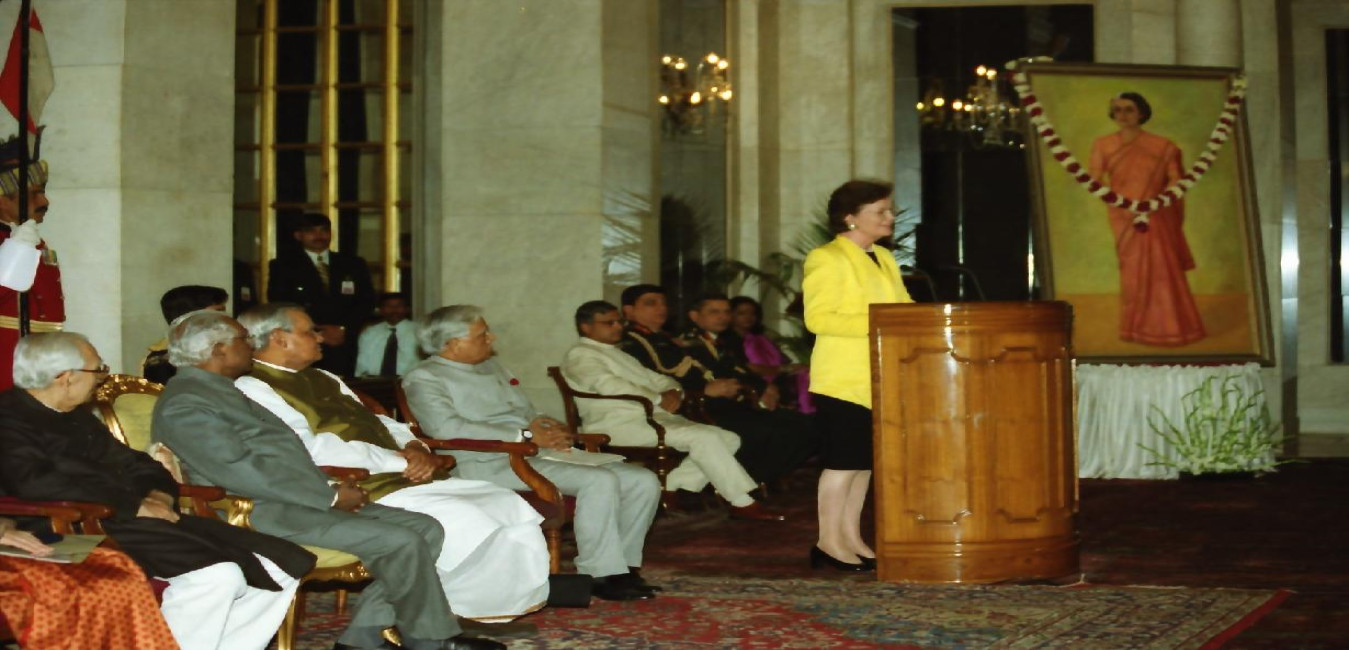 The President of India, Shri K R Narayanan presenting the Indira Gandhi Prize for 2000 to the UN High Commissioner for Human Rights, HE Mrs Mary Robinson at the Ashok Hall of Rashtrapati Bhavan in New Delhi on Nov 19, 2001