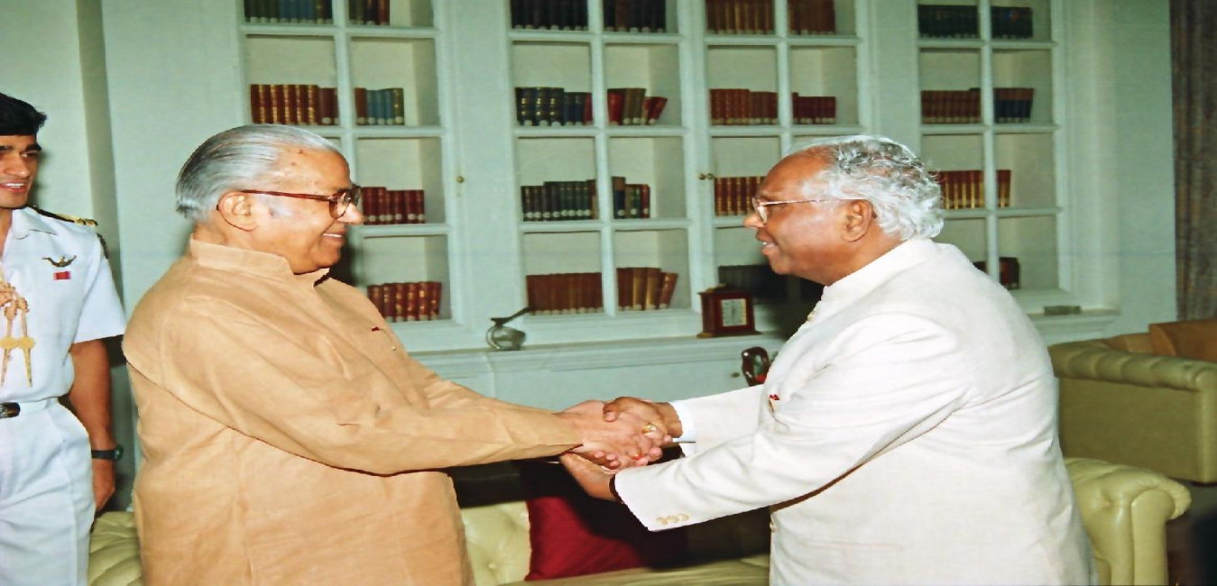 The President of India, Shri K R Narayanan meeting with the Governor of Rajasthan, Shri Bali Ram Bhagat at Rashtrapati Bhavan in New Delhi on Sep 09, 1997
