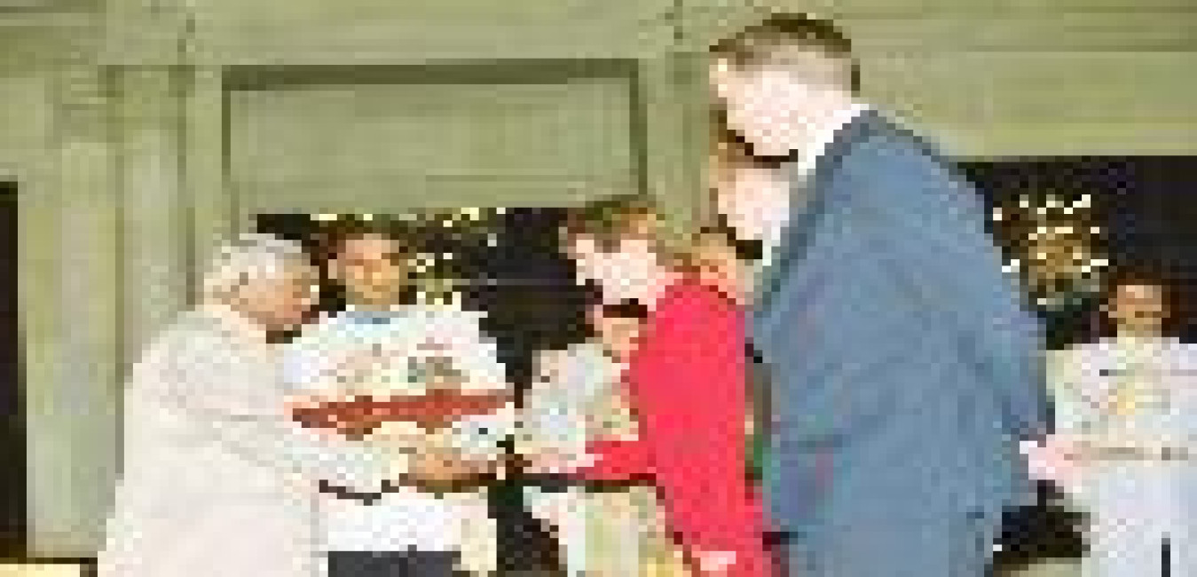 The President of India, Shri K R Narayanan with Dr (Ms) Brenda Gael McSweeney, UNDP Resident Representative with others to Present UNDP's Human Development Report 2001, "Making Technology Work for Human Development" at Rashtrapati Bhavan in New Delhi on July 04, 2001
