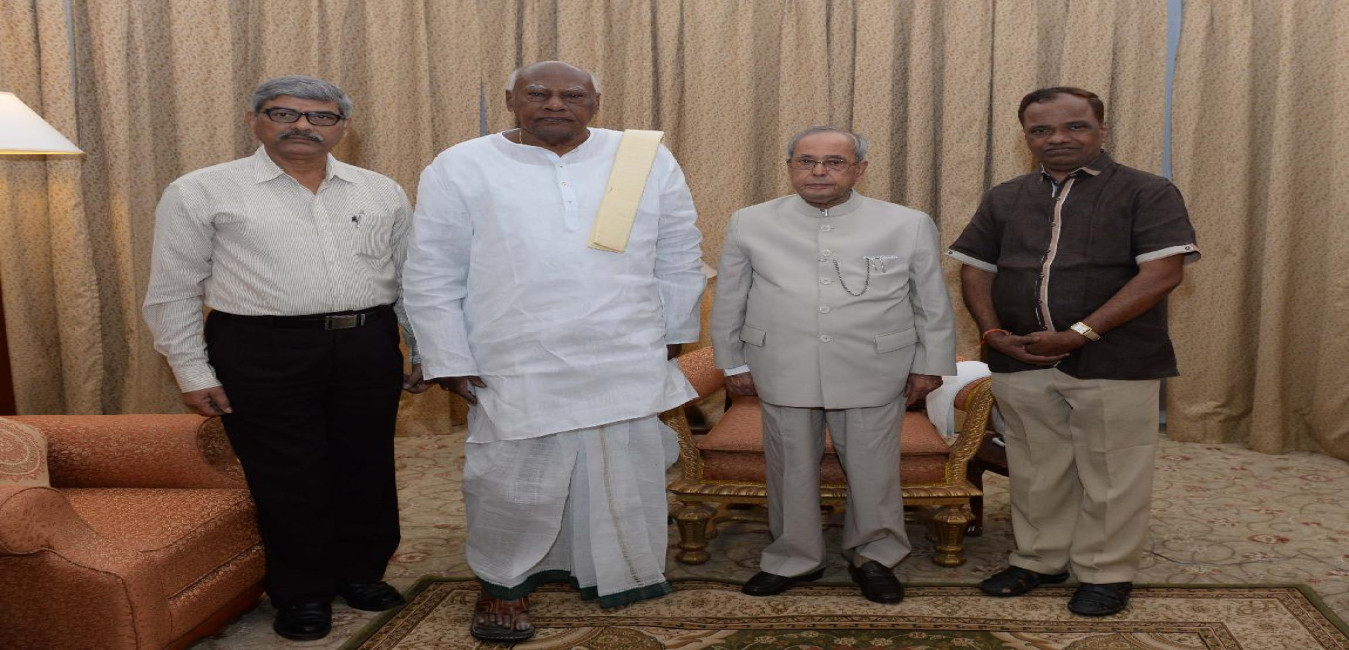 The President of India, Shri Pranab Mukherjee meeting with Dr. K. Rosaiah, Governor of Tamil Nadu alongwith his son Shri K.S.N. Murthy and daughter-in-law Smt. K. Suhasini, at Rashtrapati Bhavan on July 26, 2016.