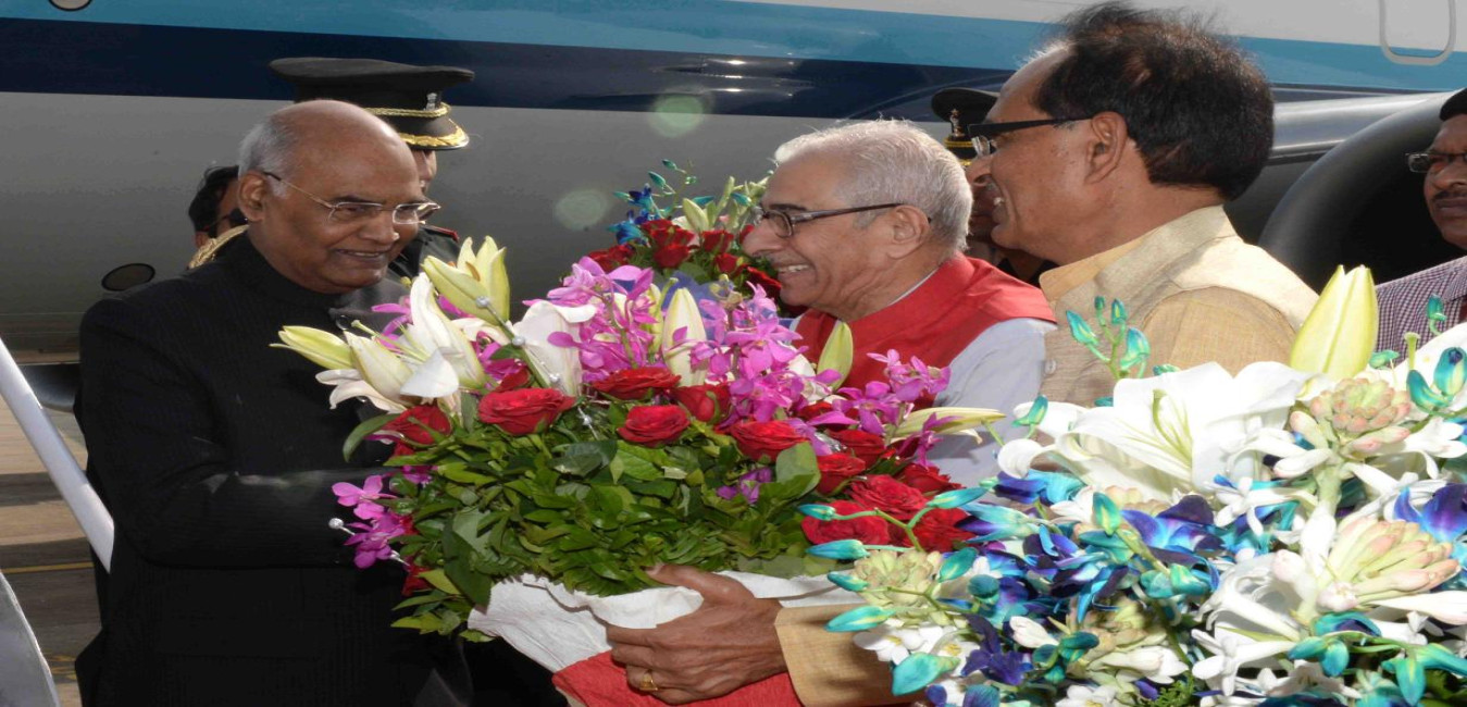 The President of India, Shri Ram Nath Kovind being received by the Governor of Madhya Pradesh, Shri Om Prakash Kohli and the Chief Minister of Madhya Pradesh, Shri Shivraj Singh Chouhan, on his arrival, at Bhopal airport, in Madhya Pradesh on November 10, 2017.