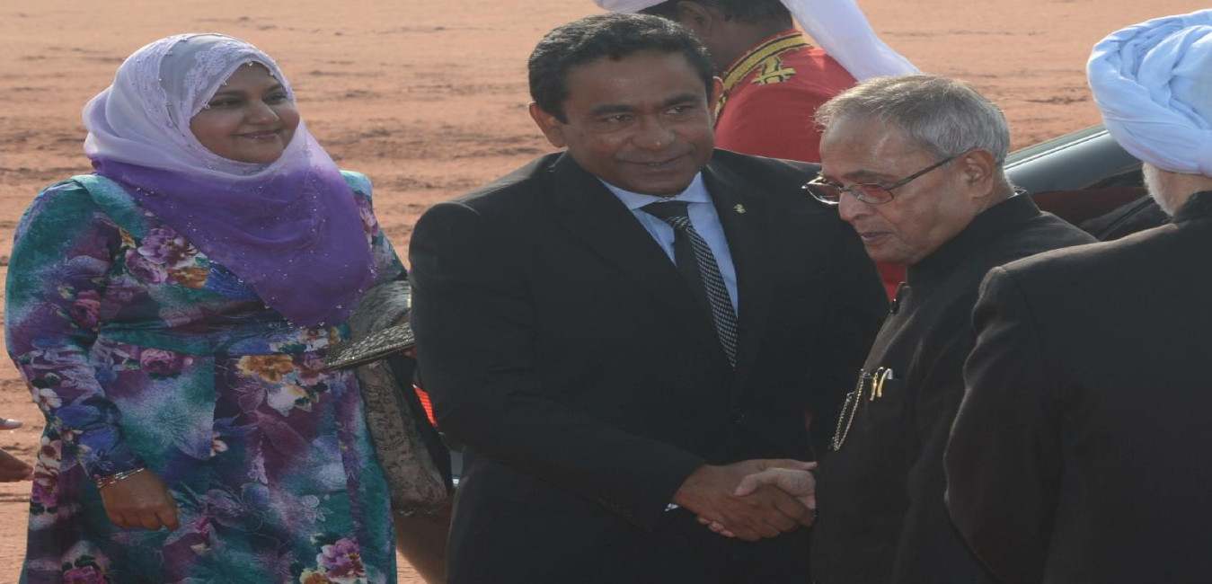 The President of the Republic of Maldives, HE Mr Abdulla Yameen Abdul Gayoom and Mrs Fatimath Ibrahim calling on the President of India, Shri Pranab Mukherjee at Rashtrapati Bhavan in New Delhi on Jan 02, 2014