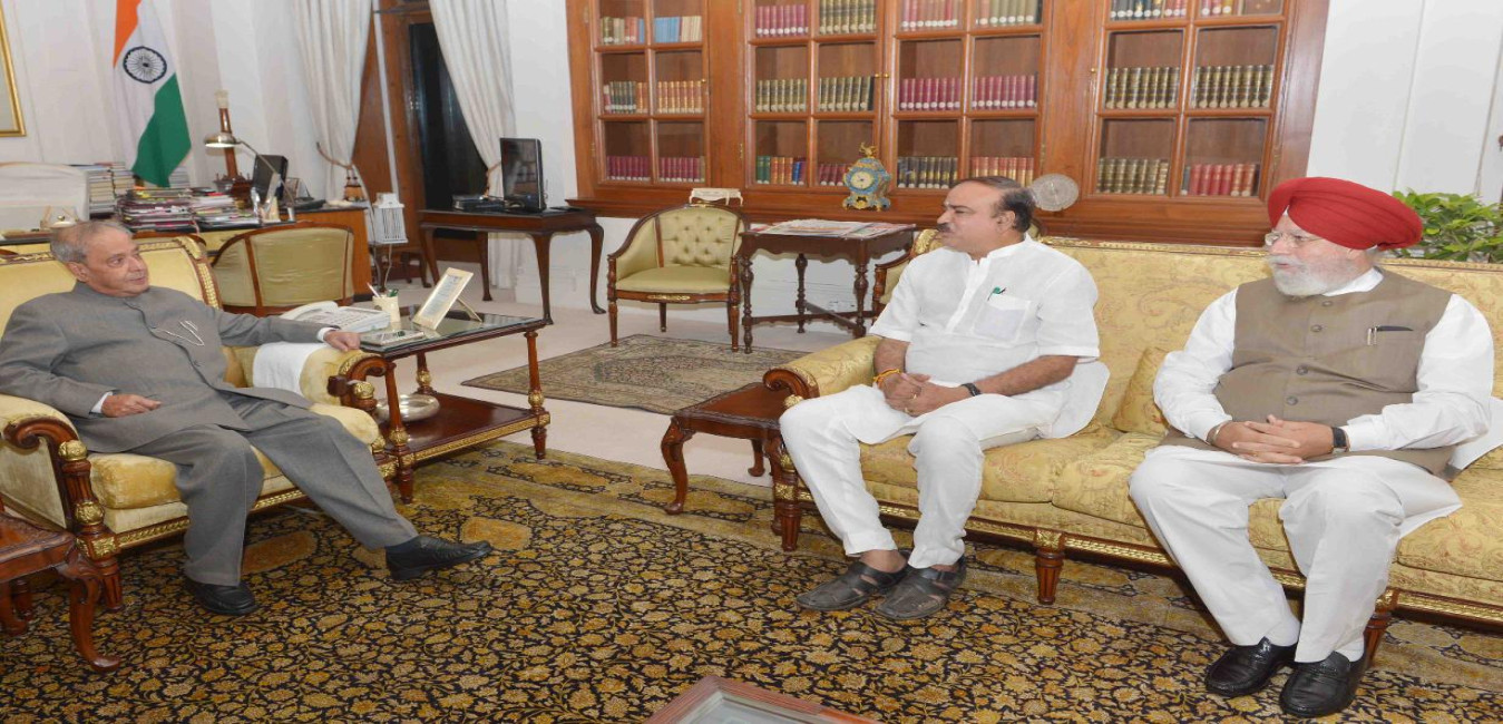 The President of India, Shri Pranab Mukherjee meeting with Shri Ananthkumar, Minister of Chemicals & Fertilizers and Parliamentary Affairs and Shri S.S. Ahluwalia, Minister of State for Agriculture & Farmers Welfare and Parliamentary Affairs, at Rashtrapati Bhavan on July 11, 2016.
