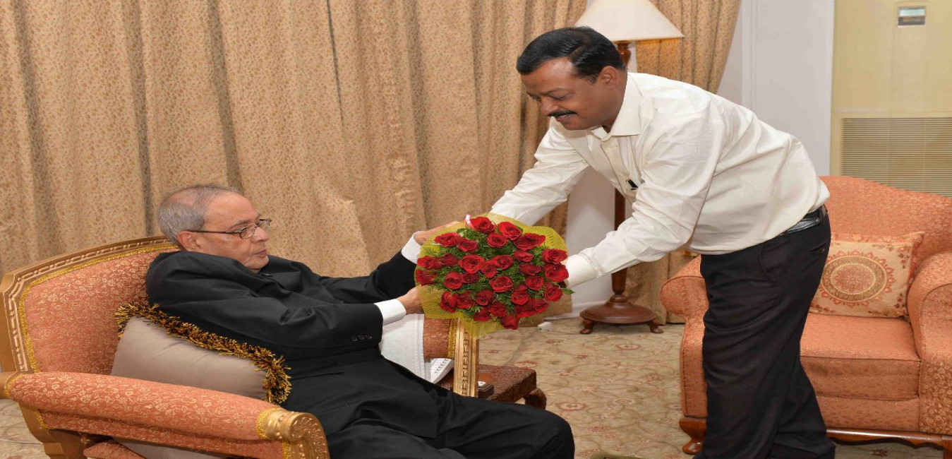 The President of India, Shri Pranab Mukherjee meeting with Smt. Anindita Mukherjee and others, at Rashtrapati Nilayam, Bolarum, in Secunderabad on July 02, 2015.