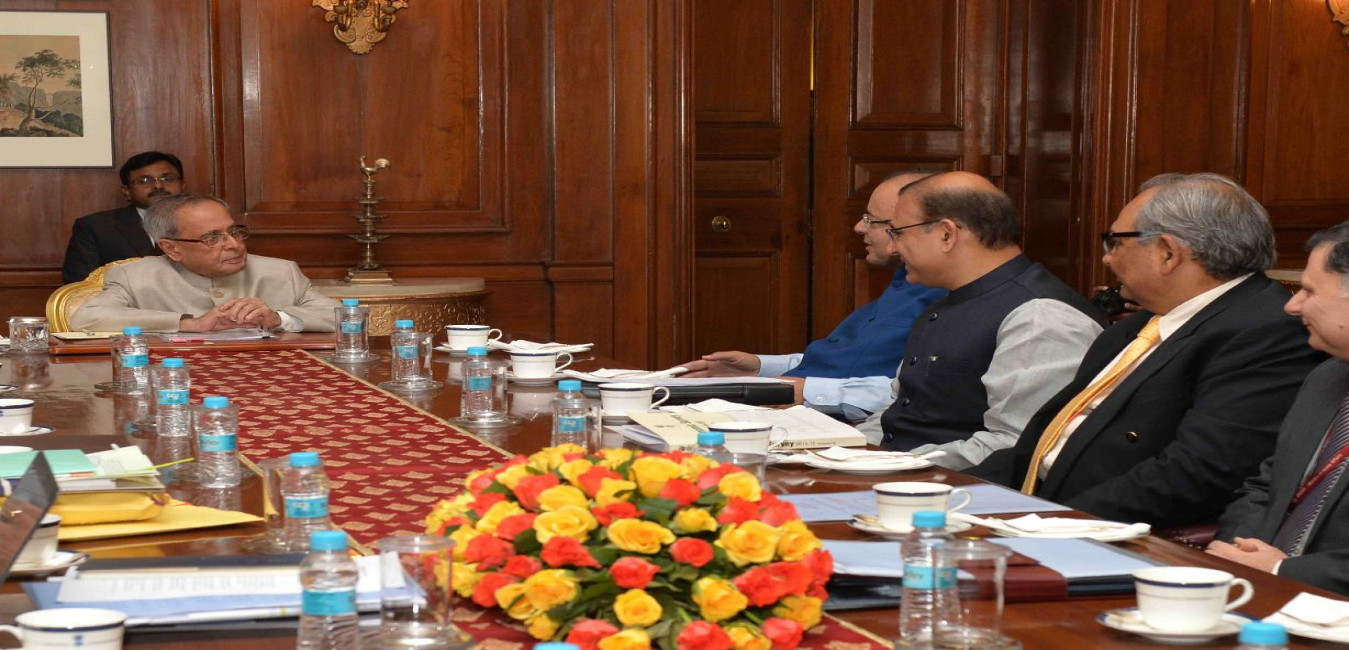 The President of India, Shri Pranab Mukherjee meeting with the Minister of Finance, Shri Arun Jaitley, the Minister of State of Finance, Shri Jayant Sinha and other officers from the Ministry of Finance, at Rashtrapati Bhavan, in New Delhi on February 28, 2015.