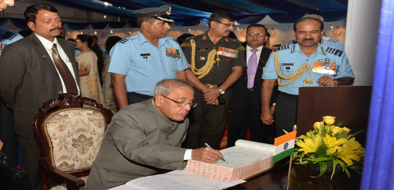 The President of India, Shri Pranab Mukherjee at the presentation of Standard to 119 Helicopter Unit and Colours to 28 Equipment Depot of Indian Air Force, at Jamnagar, Gujarat on March 04, 2016.