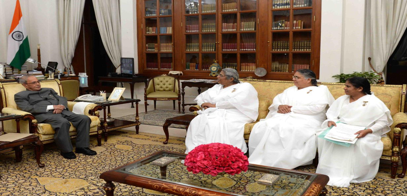 The President of India, Shri Pranab Mukherjee meeting with B.K. Asha, Director, B.K. Pushpa, B.K. Savita and B.K. Ansuya from Prajapita Brahma Kumaris Ishwariya Vishwa Vidyalaya, at Rashtrapati Bhavan on February 21, 2017.