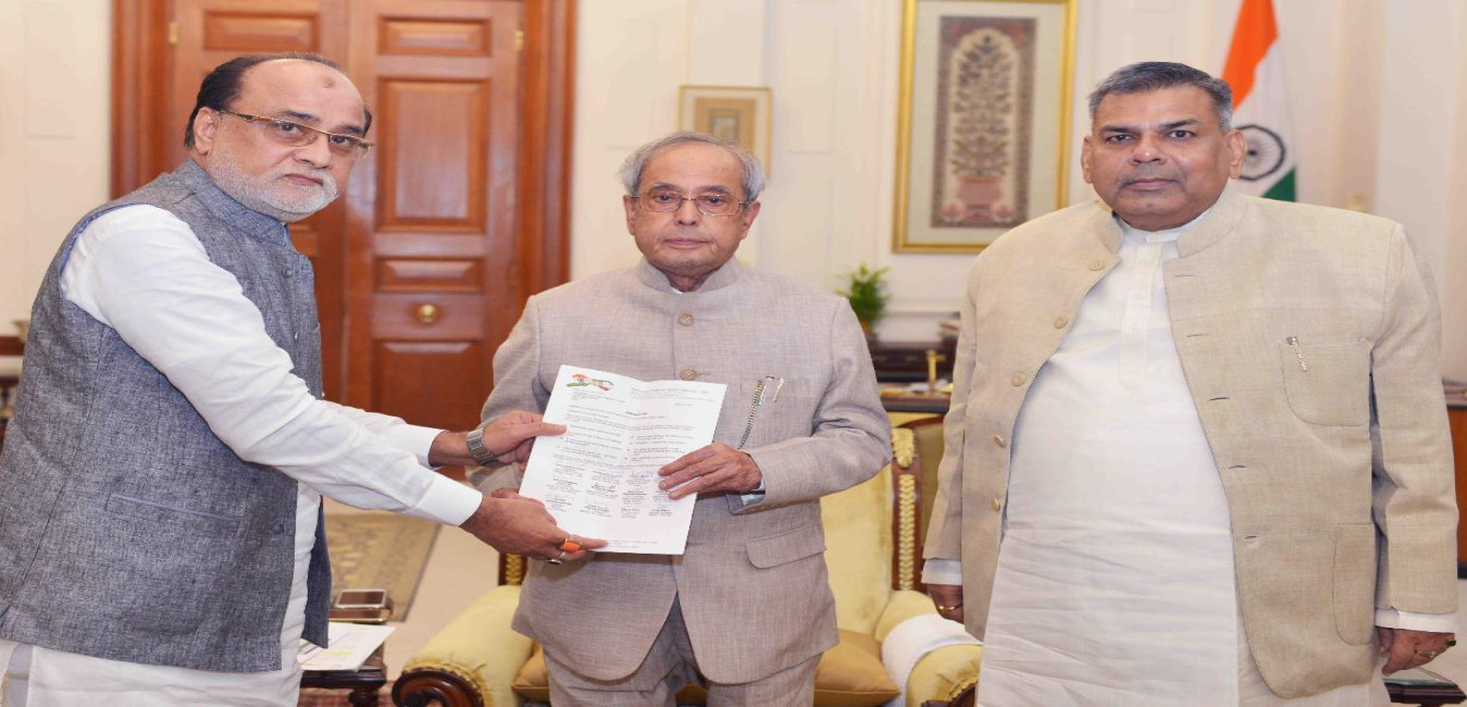 The President of India, Shri Pranab Mukherjee meeting with Shri Ashok Singh, National Vice President, INTUC & Member, Kendriya Hindi Samiti alongwith Nawab Jamin Sahib, Chairman, Indo-Iran Persian Cultural Board, Faizabad, at Rashtrapati Bhavan on August 10, 2016.