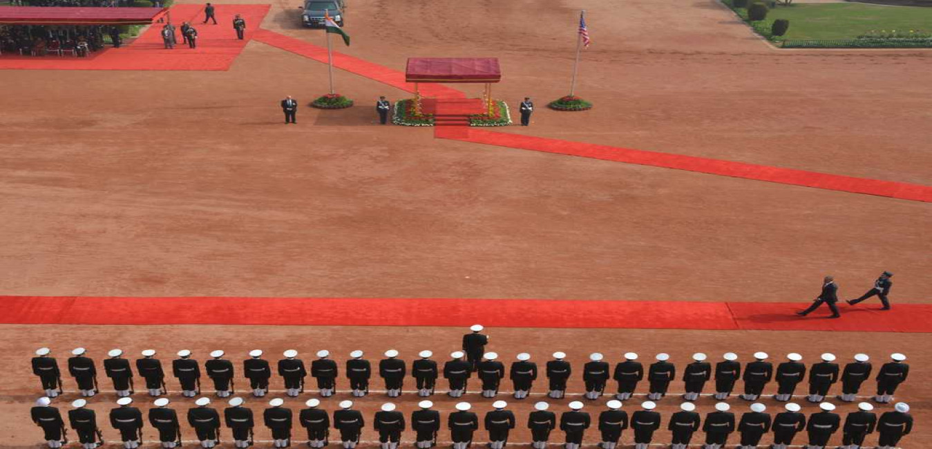 The President of India, Shri Pranab Mukherjee receiving the President of the United States of America, HE Mr Barack Obama during his Ceremonial Reception at the forecourt of Rashtrapati Bhavan, in New Delhi on January 25, 2015.