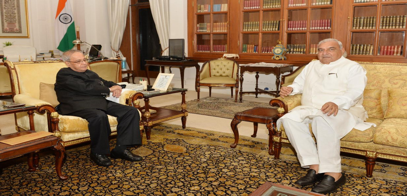 The President of India, Shri Pranab Mukherjee meeting with the former Chief Minister of Haryana, Shri Bhupinder Singh Hooda, at Rashtrapati Bhavan, in New Delhi on September 18, 2015.