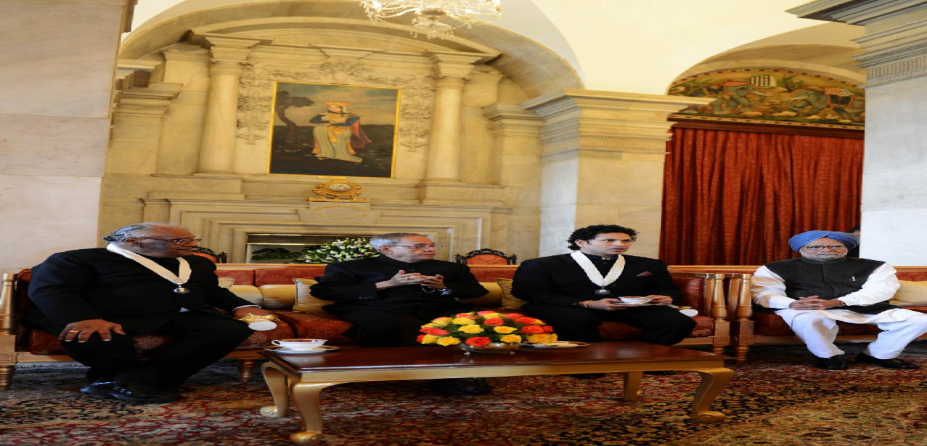 The President of India, Shri Pranab Mukherjee presenting the Country's Highest Civilian Award Bharat Ratna to Eminent Scientist Professor, C N R Rao and Legendary Cricketer, Shri Sachin Tendulkar at Durbar Hall of Rashtrapati Bhavan in New Delhi on Feb 04, 2014