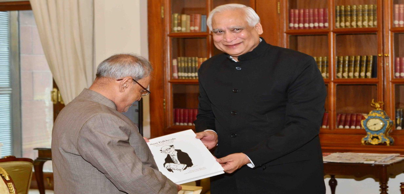 The President of India, Shri Pranab Mukherjee receiving the book ''Nani Palkhivala-God's Gift to India (Biography of a Friend'') from Dr. Dharmendra Bhandari with others from Mumbai, at Rashtrapati Bhavan on July 08, 2016.